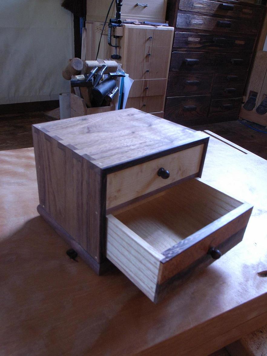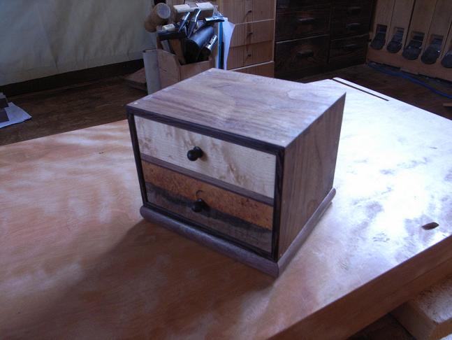 小箪笥のご注文をうけました。間口15cm、高さ12cm、奥行き13cm。箪笥まわりはウォールナット、箪笥の縁には鉄刀木を貼り、引出し前板にはメイプル(一段目)・花梨瘤とクラロウォールナットの寄木(二段目)、引出し中は桐で作りました。仕上げに米ぬかオイルを軽くふきあげました。引出しつまみも鉄刀木で自作しました。ご注文ありがとうございます。
