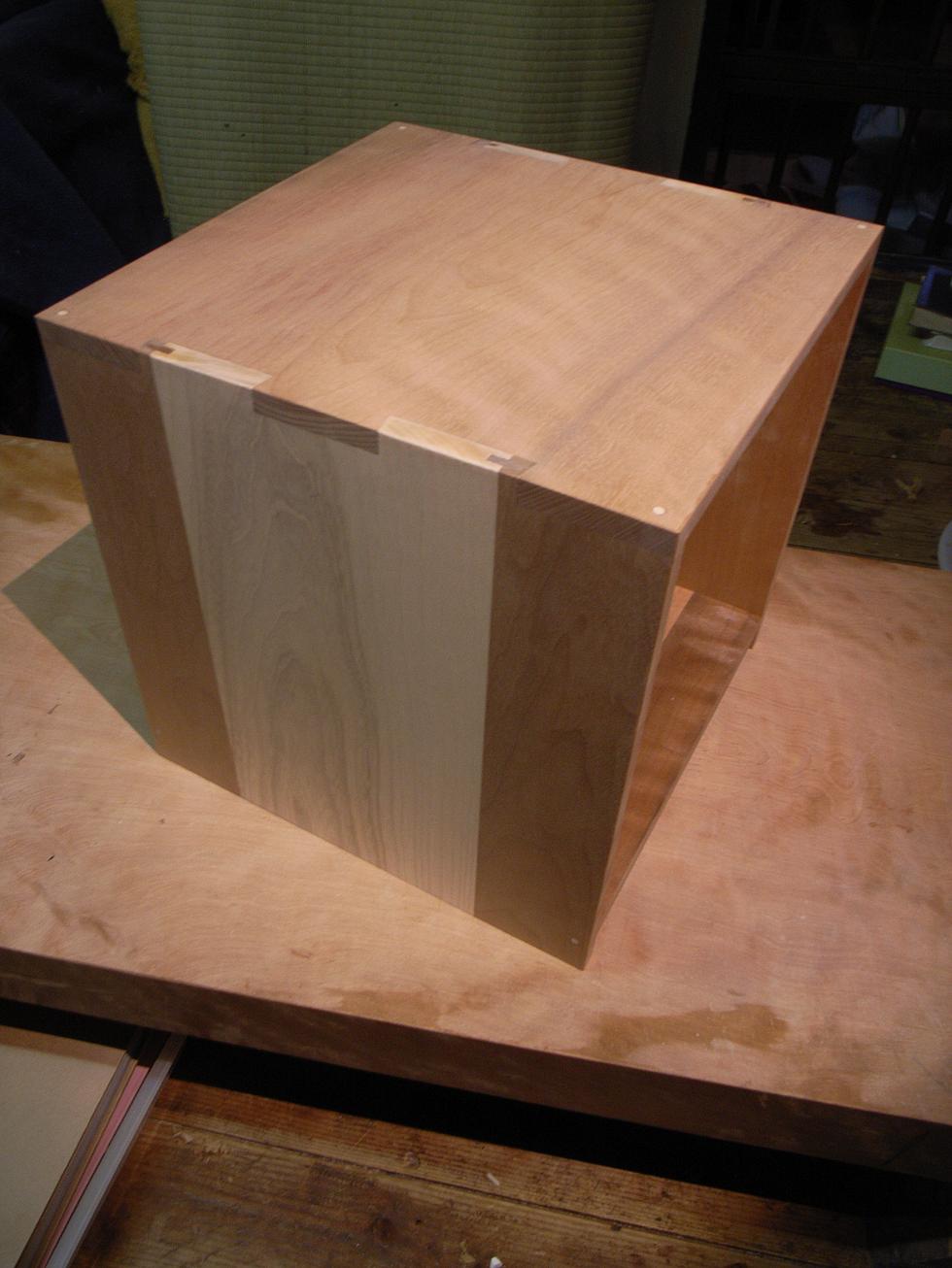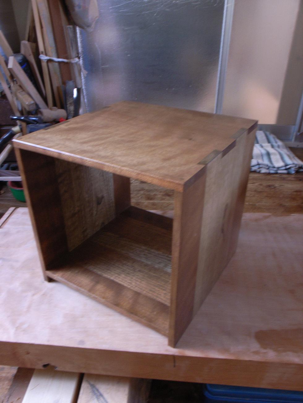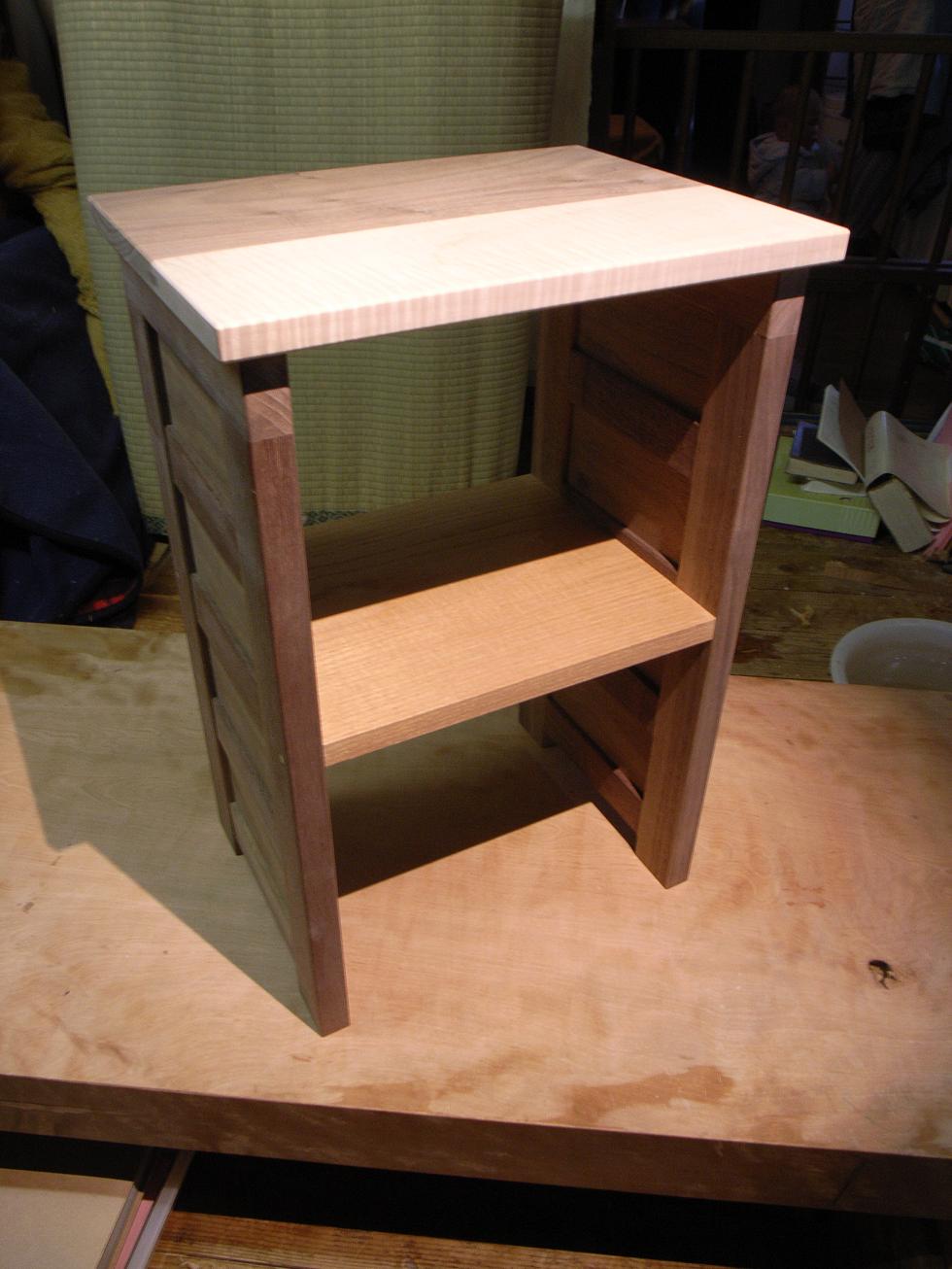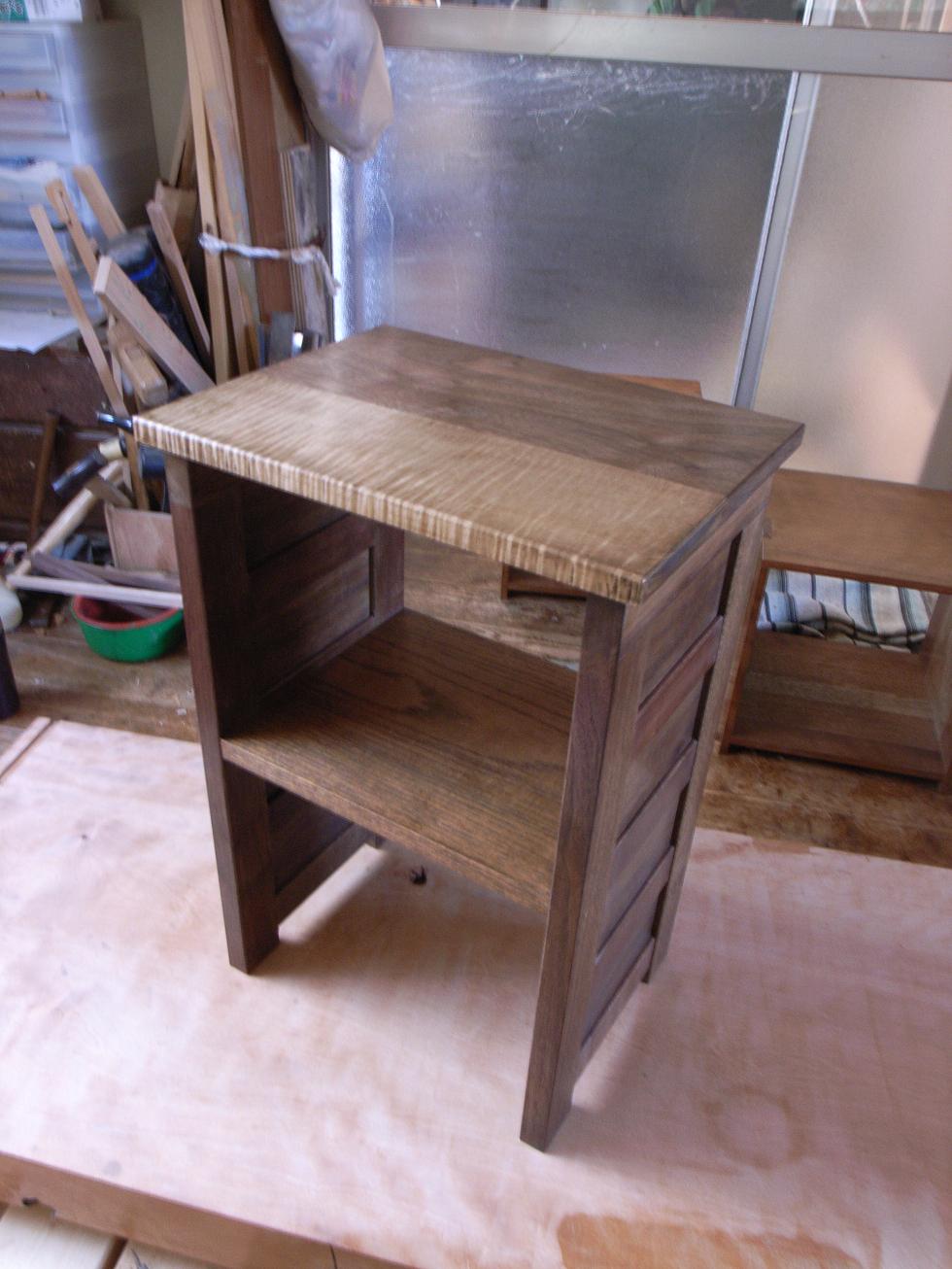 サイドテーブルと台を作りました。塗装前と塗装後の写真です。塗装はワックスです。サイドテーブルはメイプル・ウォールナット・ケンポナシで作り、台はタブノキ・栓・ケンポナシで作りました。ご注文ありがとうございました。